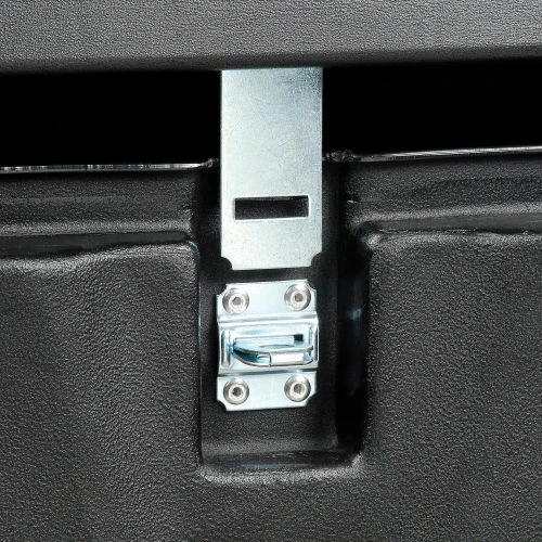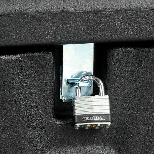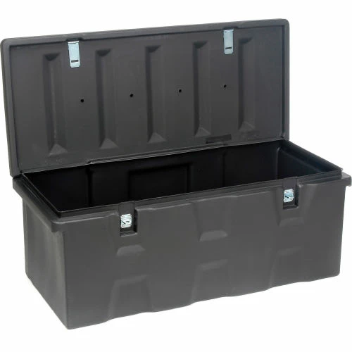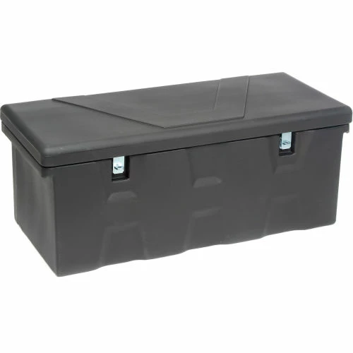 Low profile job site boxes mount to pick-up beds and trailers for convenient transport and storage. High capacity storage chests are made of heavy duty, impact resistant polyethylene that is corrosion resistant for outdoor use. Overlapping lid seals out weather to protect contents. Double panel, top opening lid features stainless steel hinges and zinc hasps for secure closure. Work site chest includes built-in carry handles.