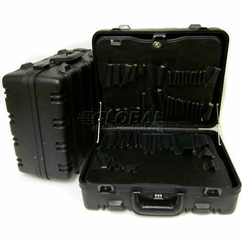 7″ deep black polyethylene plastic tool case, black aluminum tongue-and-groove gasketed frame to resist moisture & dirt, 2 black keyed locks, 3-digit combination lock, padded carry handle, vertical ribbing for added strength, top & bottom tool pallets to hold 60 tools, document pouch in lid.