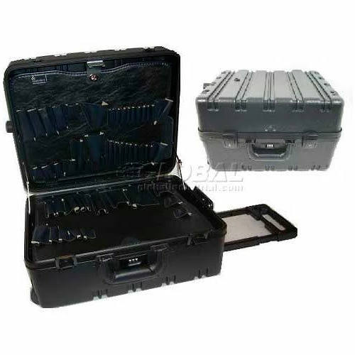 7″ deep black polyethylene plastic 2-wheeled tool case, 40″ retractable telescoping handle, black aluminum tongue-and-groove gasketed frame to resist moisture & dirt, 2 black keyed locks, 3-digit combination lock, padded carry handle, vertical ribbing for added strength, top & bottom tool pallets to hold 60 tools, document pouch in lid, additional storage under bottom pallet.