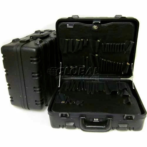 9″ deep black polyethylene plastic tool case, black aluminum tongue-and-groove gasketed frame to resist moisture & dirt, 2 black keyed locks, 3-digit combination lock, padded carry handle, vertical ribbing for added strength, top & bottom tool pallets to hold 60 tools, document pouch in lid, additional storage under bottom pallet.
