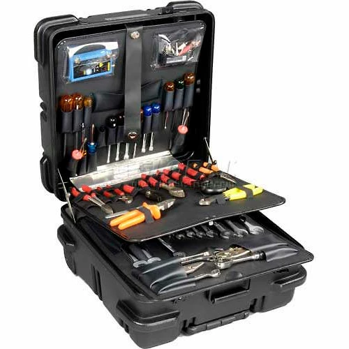 11″ deep black polyethylene plastic 2-wheeled tool case 40″ retractable telescoping handle black aluminum tongue-and-groove gasketed frame to resist moisture & dirt 2 butterfly latches padlock loops spring-loaded handle vertical ribbing for added strength unique V-hinge top pallet and bottom pallet to hold more than 60 tools 2 clear pouches for small parts document pouch in lid additional storage under bottom pallet base is foam filled.