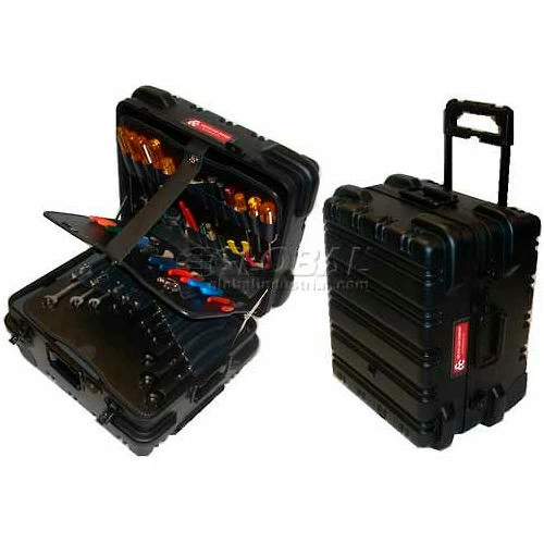 12″ deep black polyethylene plastic 2-wheeled tool case black aluminum tongue-and-groove gasketed frame to resist moisture & dirt 40″ retractable telescoping handle 2 butterfly latches and padlock loops spring-loaded handle vertical ribbing for added strength unique V-hinged top pallet and bottom pallet to hold more than 50 tools document pouch in lid additional storage under bottom pallet.