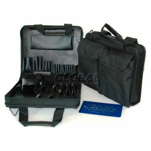 Ballistic Nylon Exterior with novolux pocket interior, 27 interior pockets include 15 for bit/driver set, 2 touch fastener loops, closed small parts pocket, 1 meter pocket, 1 external slash pocket and 2 1/2 pockets, D-rings for optional shoulder strap, convenient carry handle.