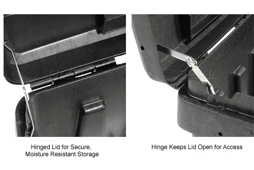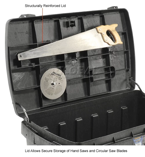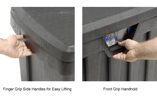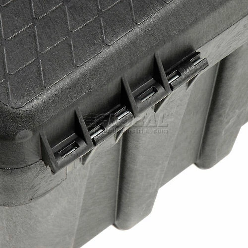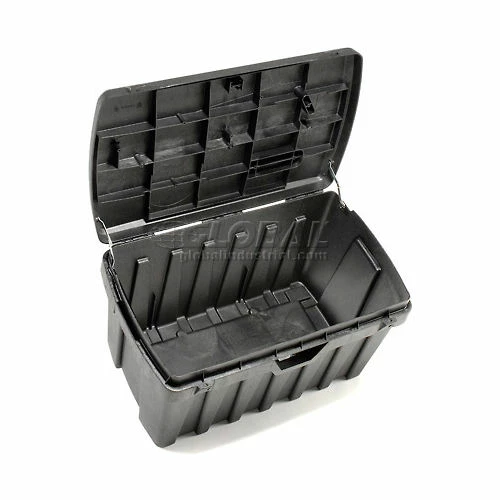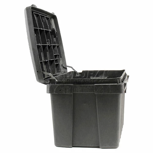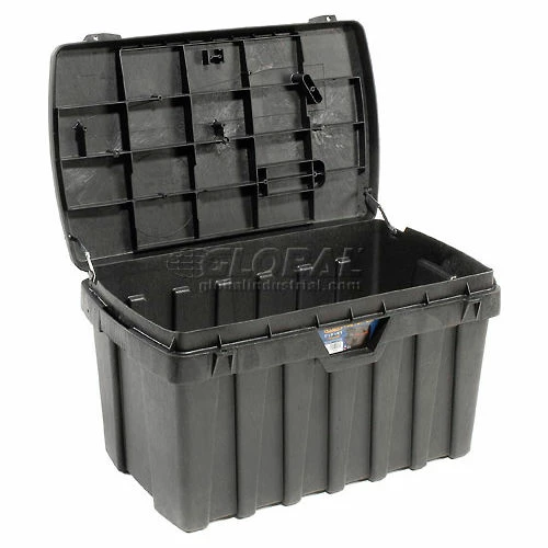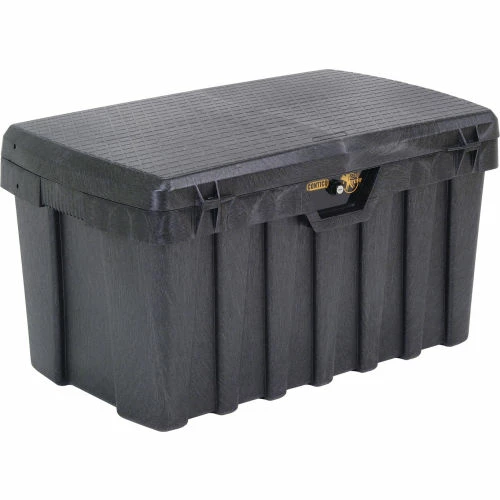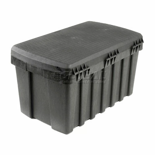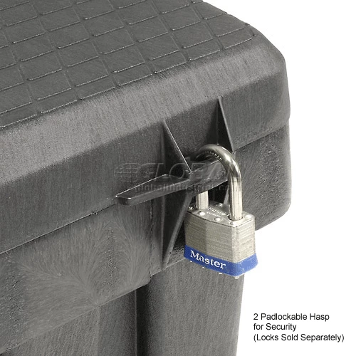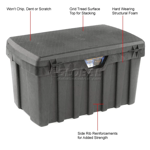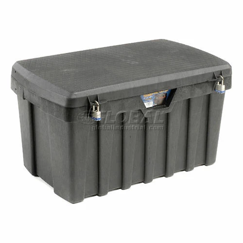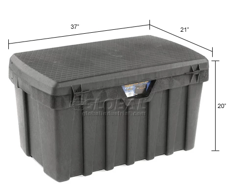 Hard-wearing chest with hinged lid provides secure, moisture resistant storage of tools, equipment and other heavy items. Ideal site box to keep operations well supplied. Made from sturdy structural foam that won’t chip, dent or scratch. This stationary chest has 2 lock hasps (locks sold separately) and side handles for easy lifting. Measures 37″L x 21″W x 20″H.