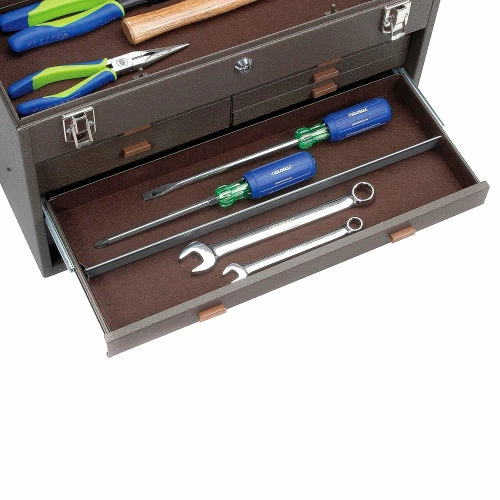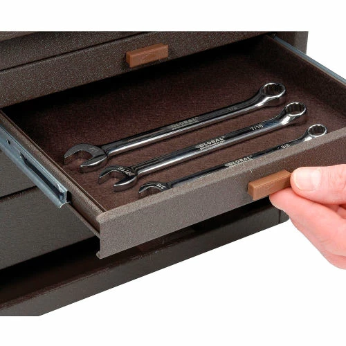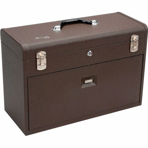 Kennedy®7-Drawer Machinist Tool Chest offers high quality and durability that’s been handed down by generations of American craftsmen. Drawers and top-till feature wool felt lining. Top handle is made of vinyl cushioned steel for a durable, yet comfortable grip. Drawers include adjustable, zinc-coated steel drawer dividers for organized storage. Spring clips in drawers hold contents in place. Tubular lock secures all drawers. 20-1/8″ wide. Brown powder coat finish.