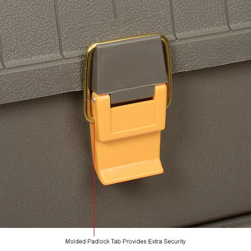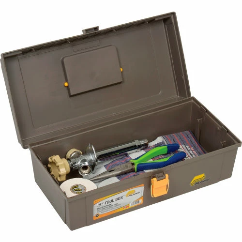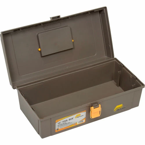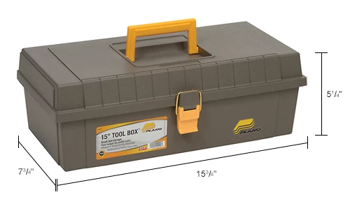 Plano 15 inch Tool Box features open bulk storage compartment. It is great for storing tools, large items and small parts. The heavy-duty carry handle and secure brass bailed latches make transportation easy. The molded padlock tab allows you to add an extra layer of security.