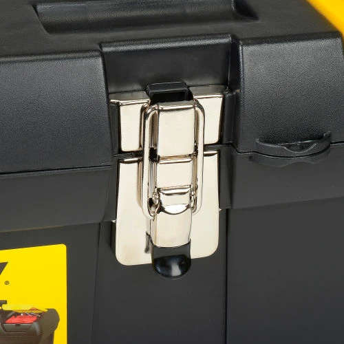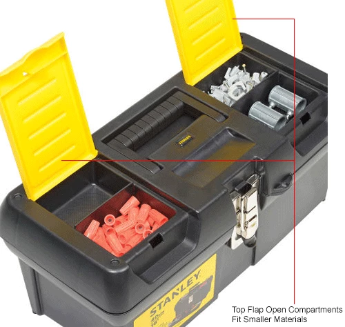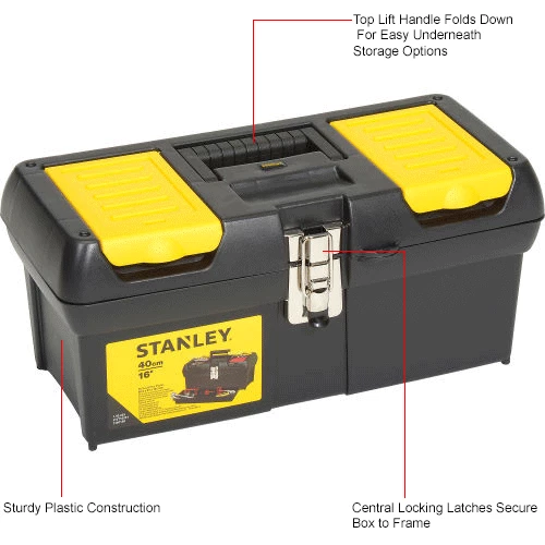 Stanley® 016013R, 16″ Series 2000 Tool Box with Tray Two lid organizers for small parts storage – accessible without opening the tool box. Built-in pad lock eye for small locks helps keep contents secure. Soft, wide rubber-coated handle allows for easy and comfortable grip. Nickel-plated metal latches. Full-length tote tray.
