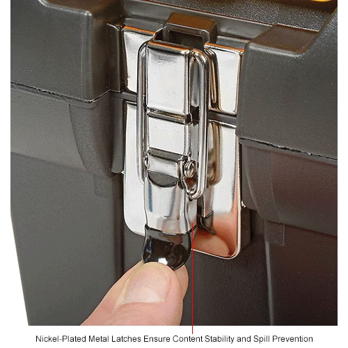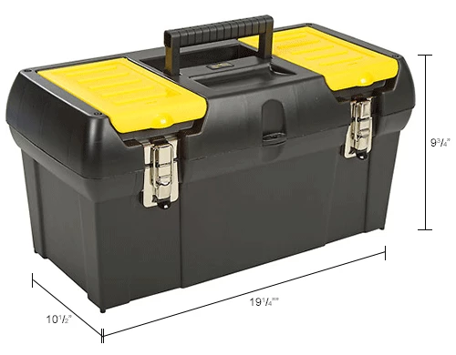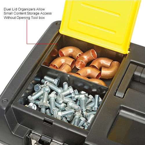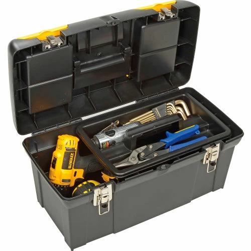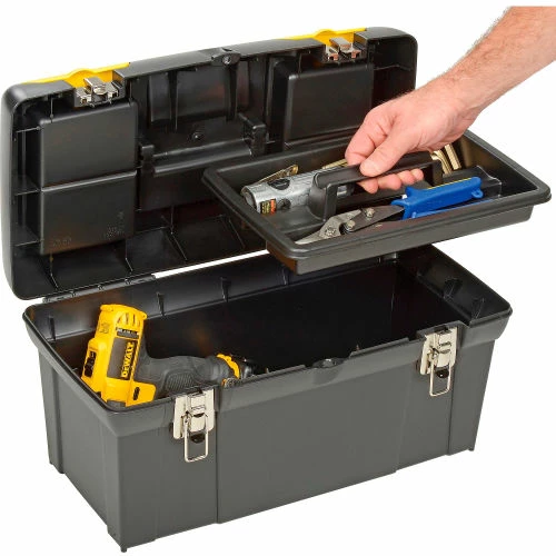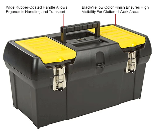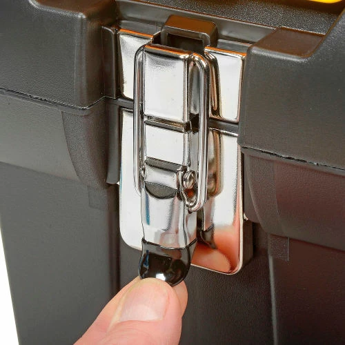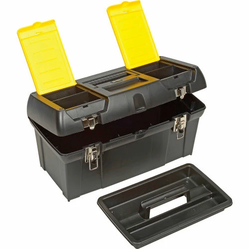 Stanley® 019151M, 19″ Series 2000 Tool Box with 2/3 Tray Two lid organizers for small parts storage – accessible without opening the tool box. Built-in pad lock eye for small locks helps keep contents secure. Soft, wide rubber-coated handle allows for easy and comfortable grip. Nickel-plated metal latches. 2/3 tote tray.