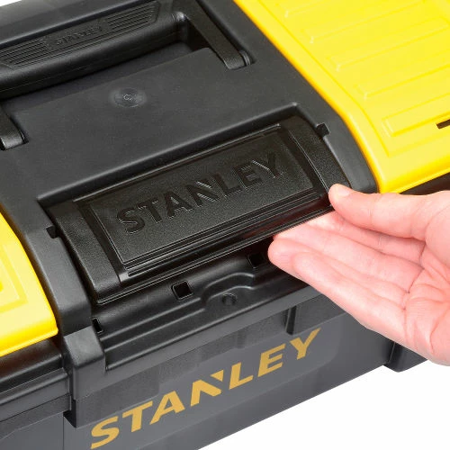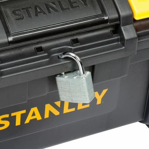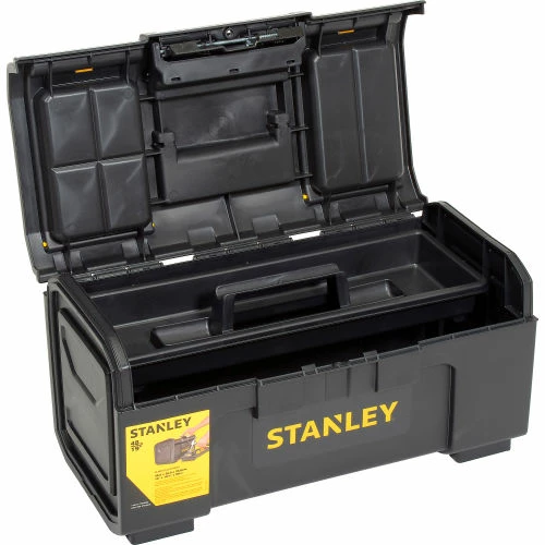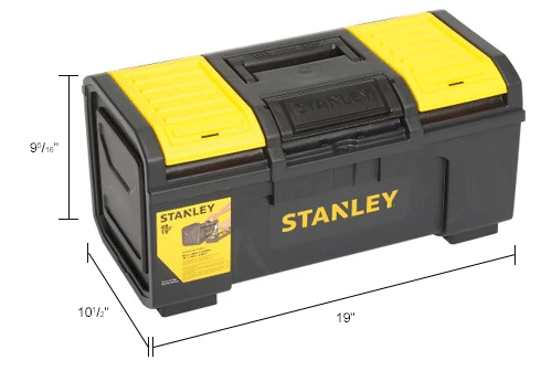 Stanley 19″ Basic Tool Box is made from polypropylene resin for lasting durability and performance. Center latch permits one hand open and close for easy operation when other hand is occupied. Extra-wide soft grip handle provides easy lifting. Removable tray has plenty of space for large hand tools to be stored underneath. Organizers on top lid provide separate organized storage of small parts and accessories. Overall size is 10-1/4″Wx18-8/9″Dx9″H.