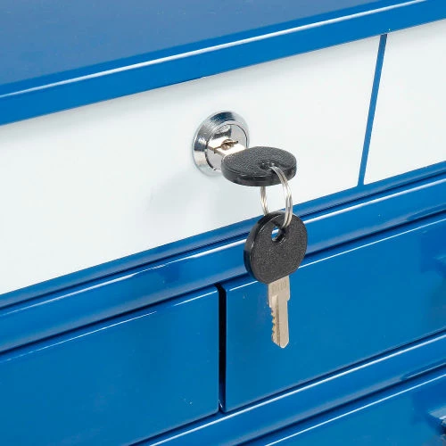 - 5 drawers (three 1.5″ deep, one 3″ deep and one 5″ deep) all preassembled and keyed the same